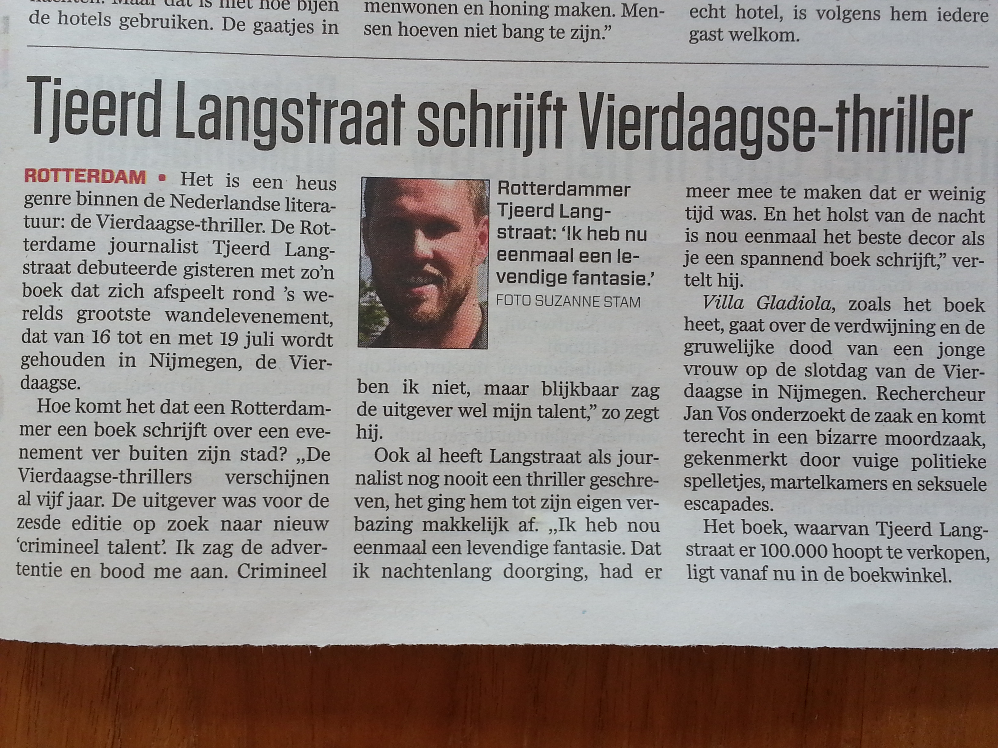De Rotterdamse ondernemer en journalist Tjeerd Langstraat was afgelopen tijd het levende cliché van de zwoegende schrijver. Maandenlang werkte hij tot diep in de nacht aan zijn thriller Villa Gladiola, die 1 juli ter ere van de Nijmeegse Vierdaagse uitkomt. “Uiteraard schreef ik met wat goede biertjes erbij.”